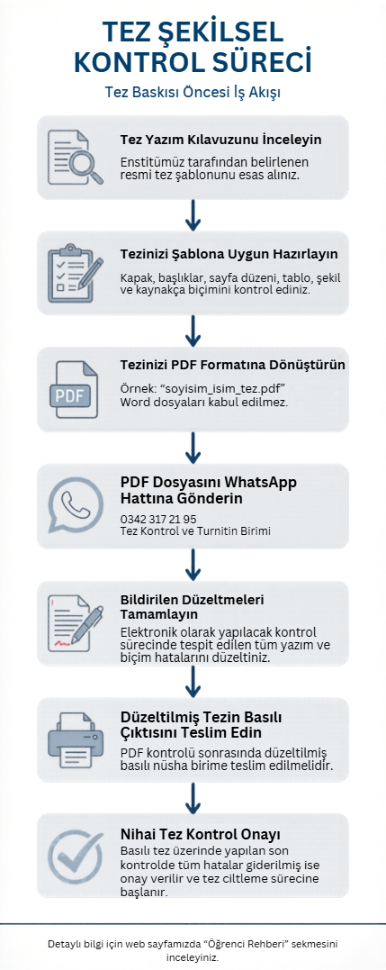 PDF üzerinden yapılan kontroller tamamlandıktan sonra, düzeltilmiş tezinizin basılı çıktısını birimimize teslim ediniz.